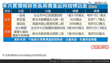 位於中正區羅斯福路四段公館商圈的「台大尊邸」,其1、2樓店面以總價3.48億元成交,為本次店面最高總價,該筆面積共165坪,分別出租給連鎖服飾店「NET」與玉山證券。根據謄本顯示,買方為新聯國際開發,其負責人宋張美玉為知名台商宋良浩妻子。